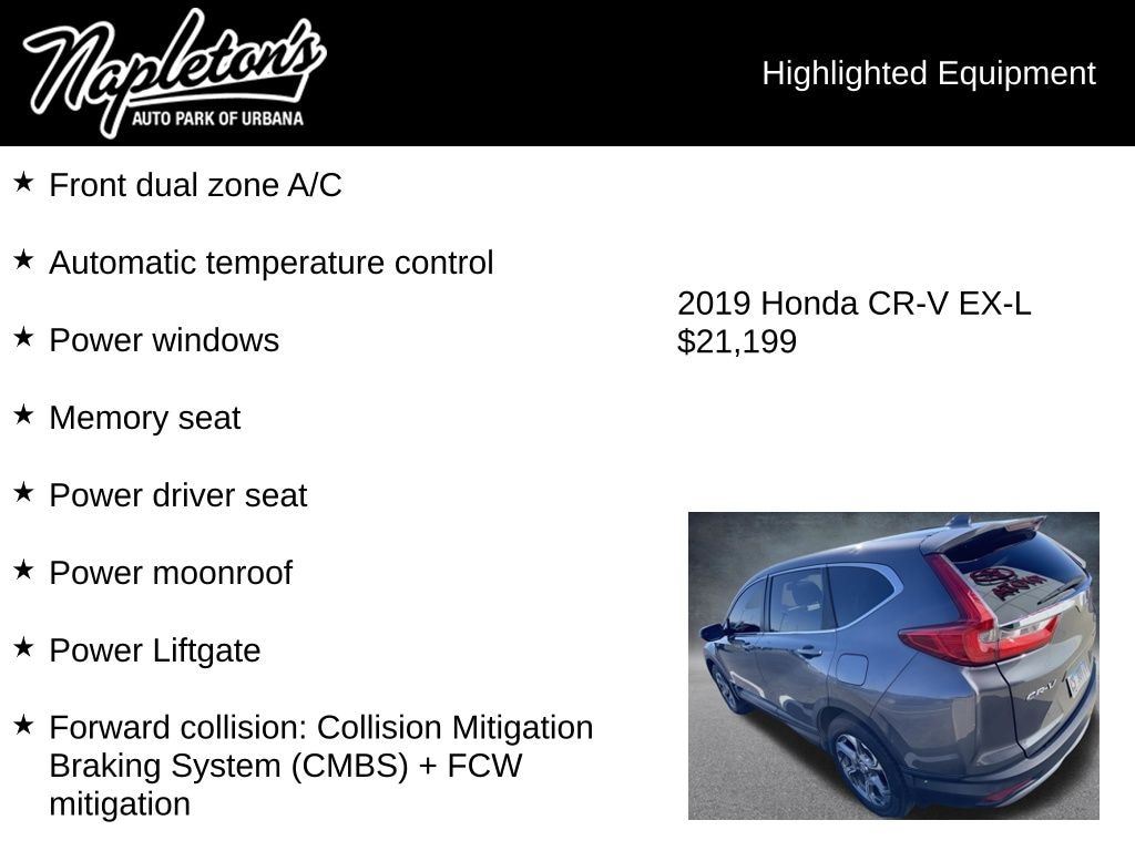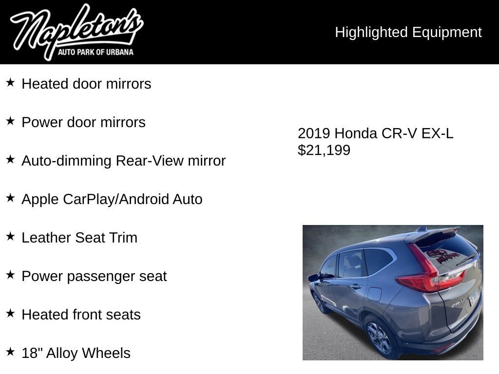 This exceptional 2019 Honda CR-V EX-L is a true standout in its class, offering a seamless blend of style, performance, and cutting-edge features. Experience the difference for yourself by scheduling a test drive at our dealership today. We're confident you'll be impressed by the exceptional value and unparalleled driving experience this SUV has to offer.