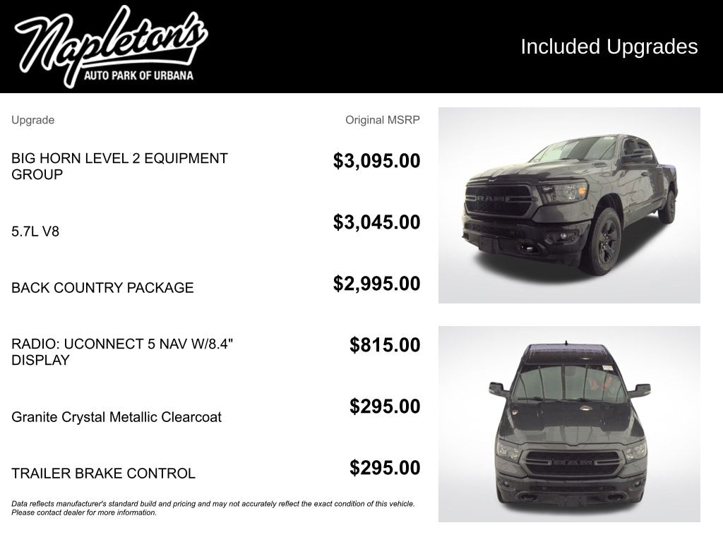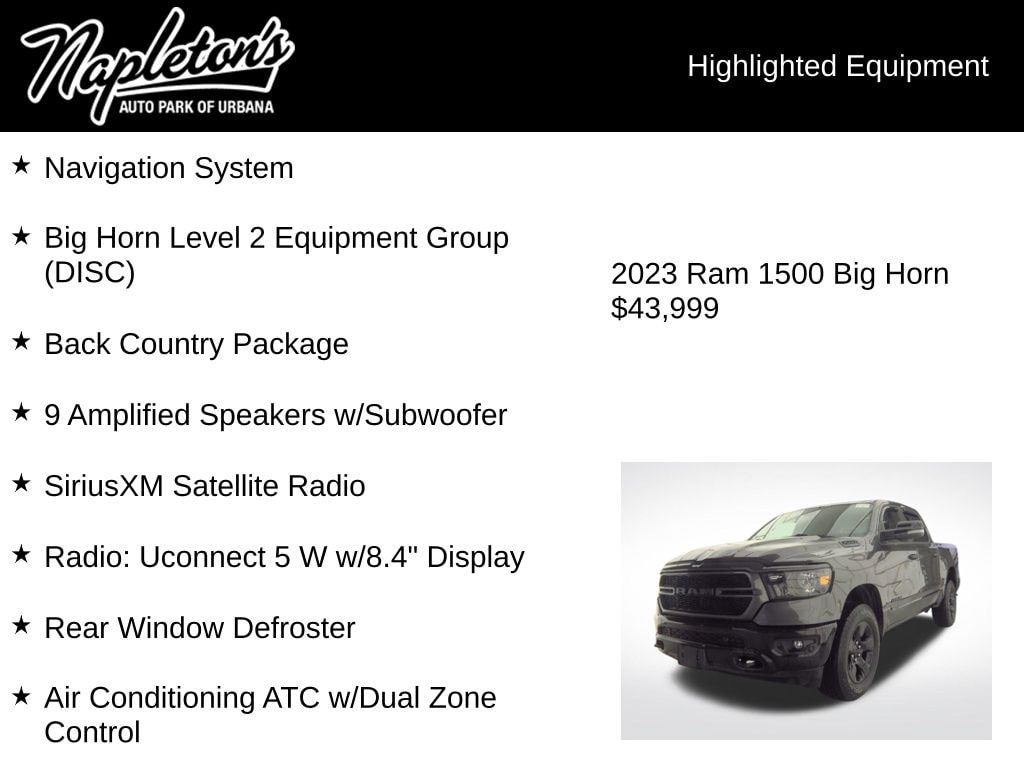 Discover the perfect blend of capability, technology, and style with this 2023 Ram 1500 Big Horn/Lone Star Back Country Package. Boasting a powerful HEMI 5.7L V8 engine with eTorque and 4-wheel drive, this truck is ready to take on any adventure. Elevate your driving experience with the comprehensive Big Horn Level 2 Equipment Group, which includes a host of premium features like the Uconnect 5 infotainment system with an 8.4-inch touchscreen display, Apple CarPlay, Android Auto, and a premium 9-speaker audio system.