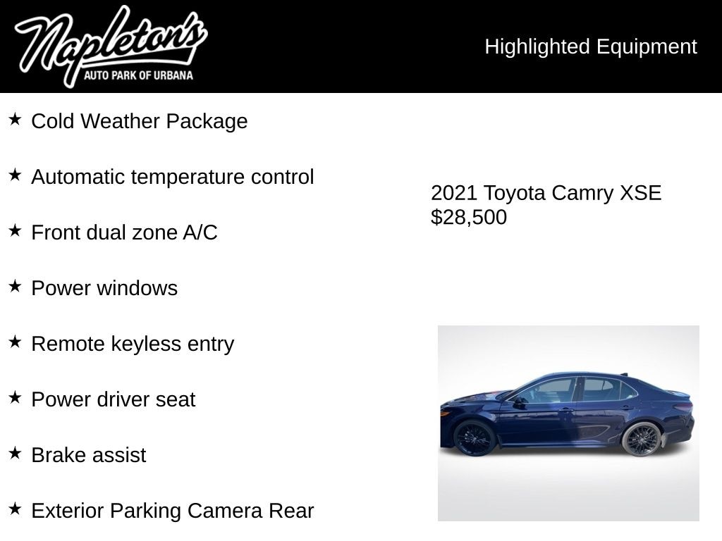 Discover the exceptional value and uncompromising quality of the 2021 Toyota Camry XSE with Cold Weather and Panoramic Roof Packages. Experience the perfect blend of style, technology, and performance that will elevate your driving experience. Visit our showroom today and let us demonstrate how this remarkable vehicle can enhance your life.